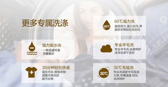 为了满足用户的不同需求,该款洗衣机采用多种专属洗涤程序。60℃强力洗程序,强劲动力去污,顽固污渍也能轻松洗净。专业羊毛洗程序,轻柔呵护羊毛织物,洗涤过程中不会变形。