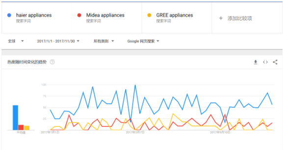 Google Trends能够显示关键字在一段时间里的相对受欢迎程度。通过在Google Trends上的一段数据(12月16日截取),我们可以发现,中国三大家电巨头在今年前11个月的全球用户搜索指数。其中,海尔优势明显,其所代表的蓝色趋势图持续处于上方,成为中国家电企业中最受青睐的品牌。