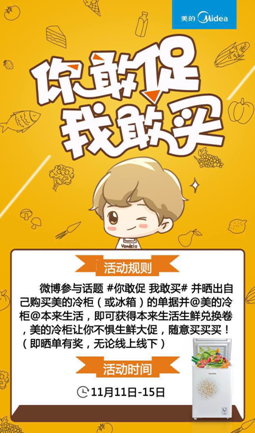 同时,对于购买美的冰柜的用户,回馈力度更给力。11月11日至15日期间,用户可以同时在美的冷柜和本来生活网微博上参与#你敢促 我敢买#活动,用户晒出购买冷柜的单据,可以获得高额本来生活网促销卷以及美的冷柜抽奖机会。优惠力度更大,获奖几率更高,许多用户表示找不到单据好着急啊。